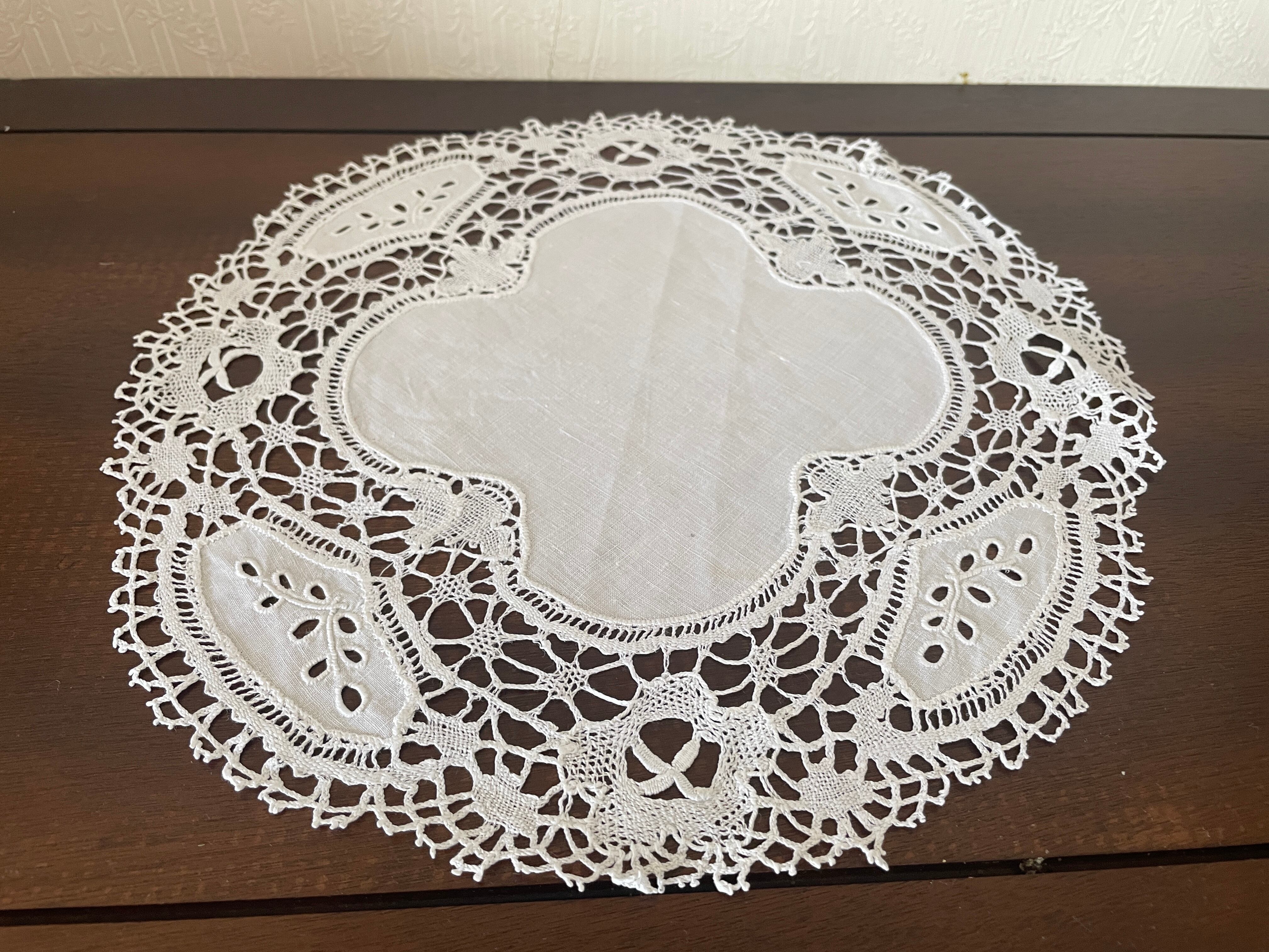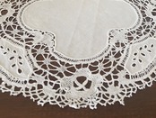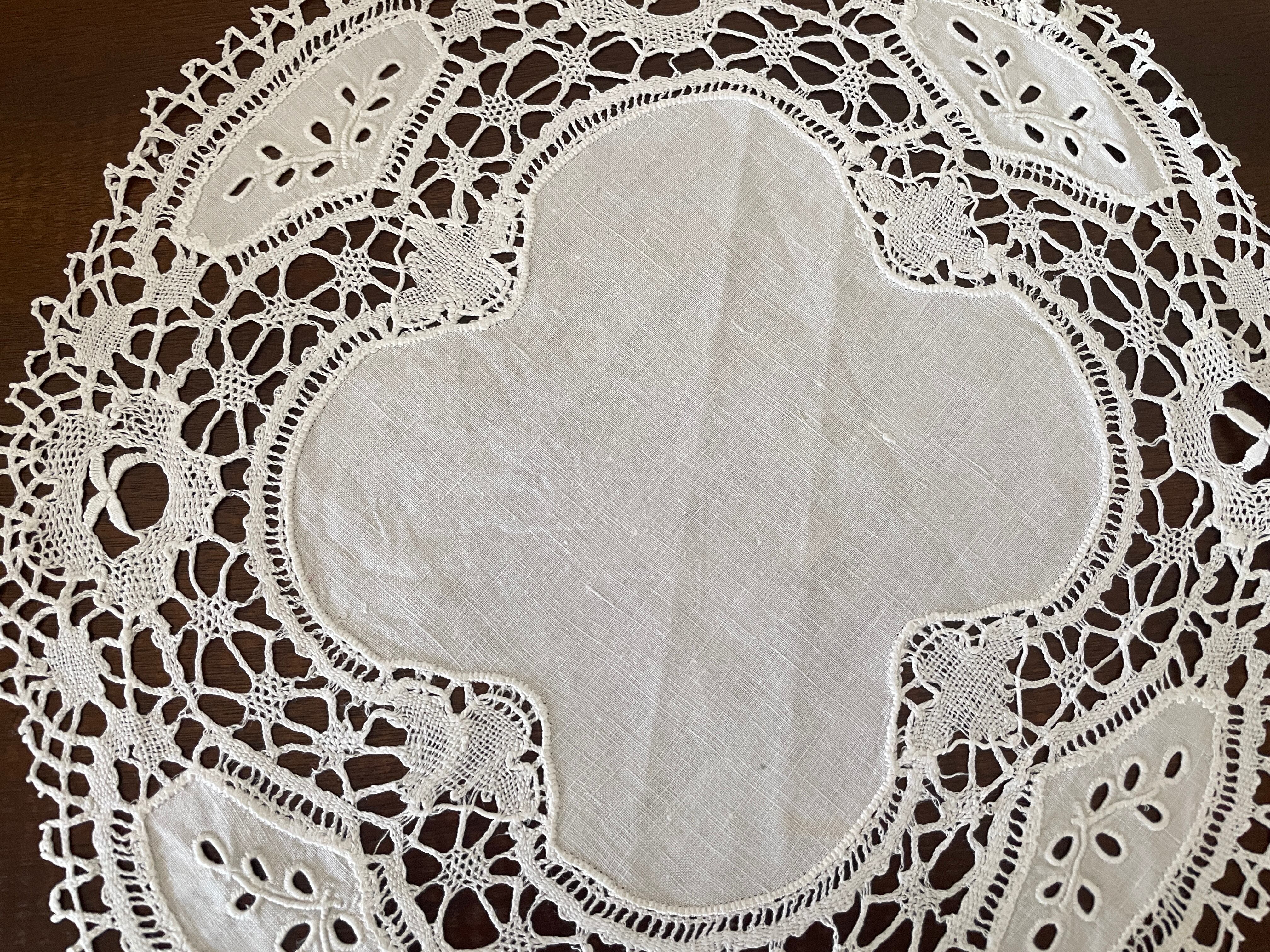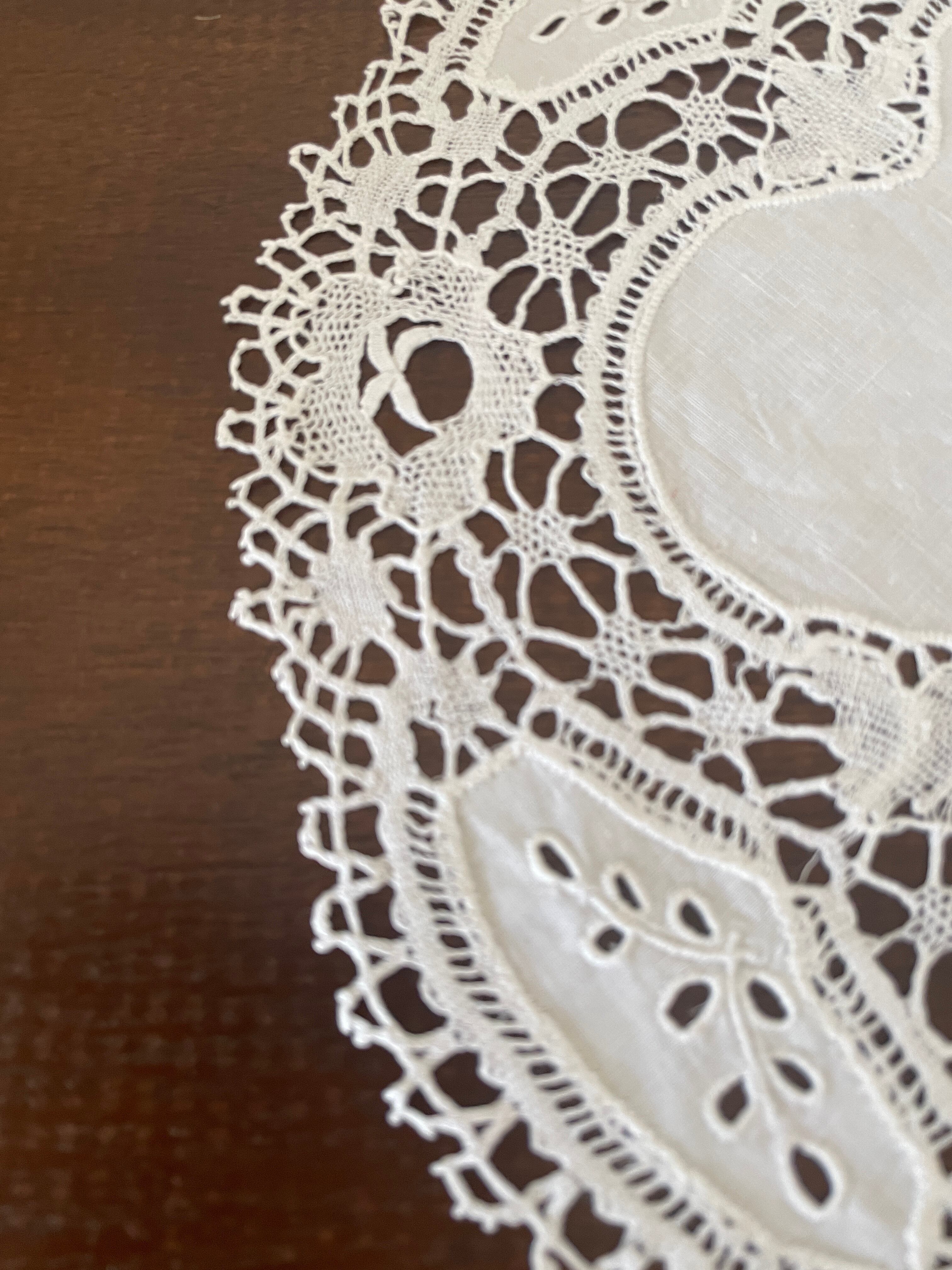 中央はリネン、周りは周りはトーションレースで編まれています。