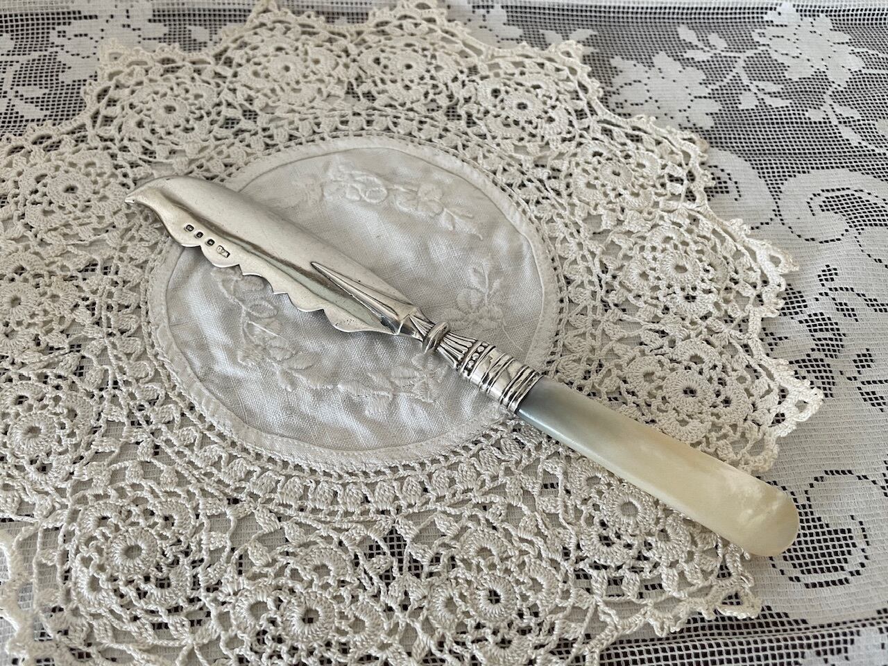 ハンドルがマザーオブパール、刃は、純銀(スターリングシルバー925)のバターナイフです。