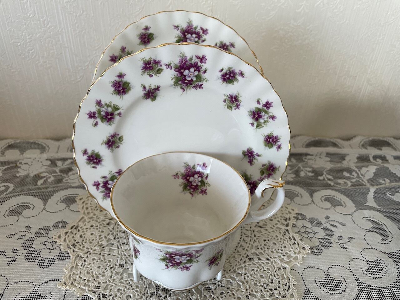 可憐なスミレの小花が散りばめられた、トリオ(カップ、ソーサ、ケーキプレート)です。