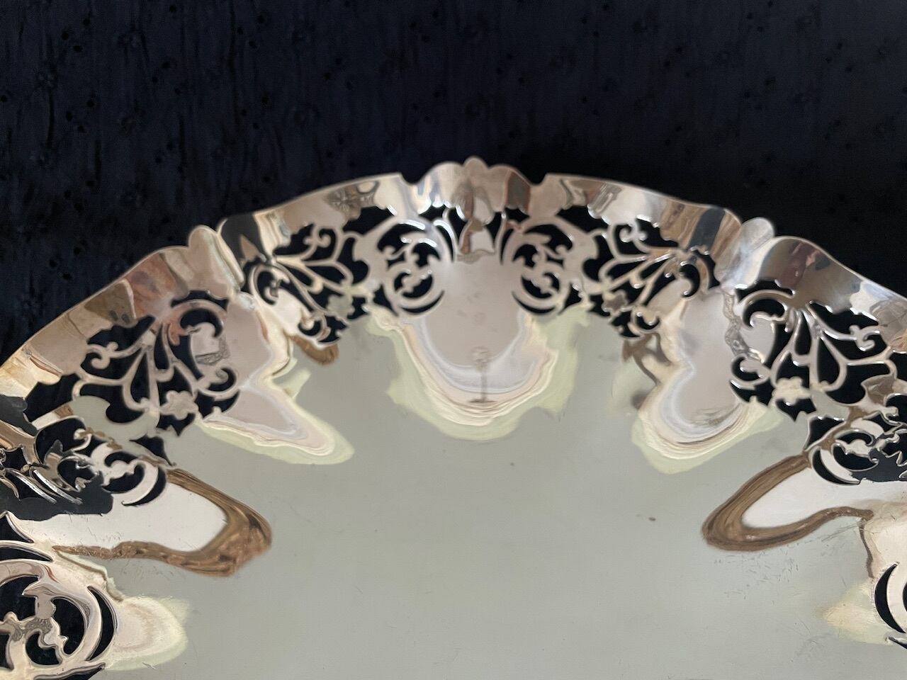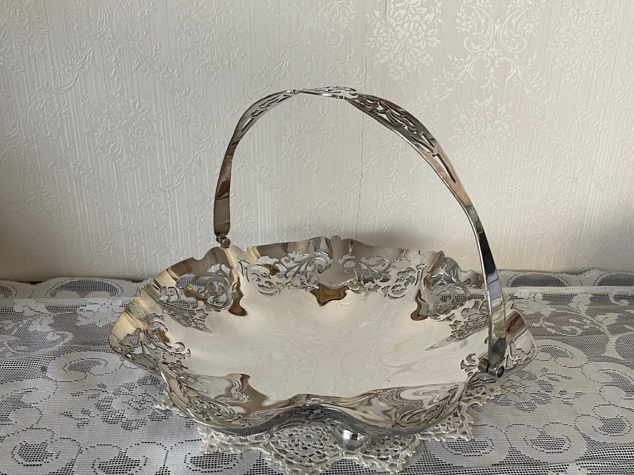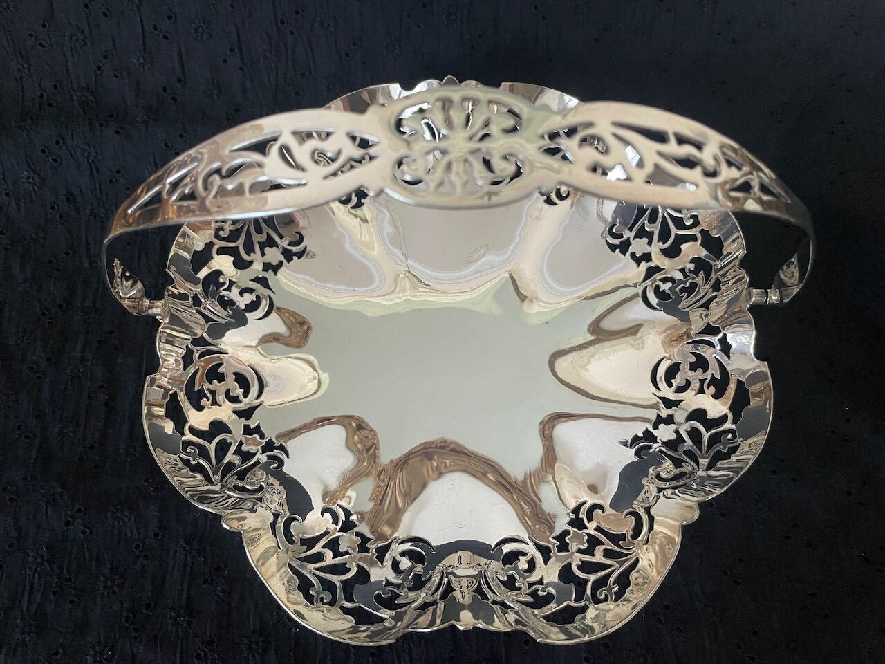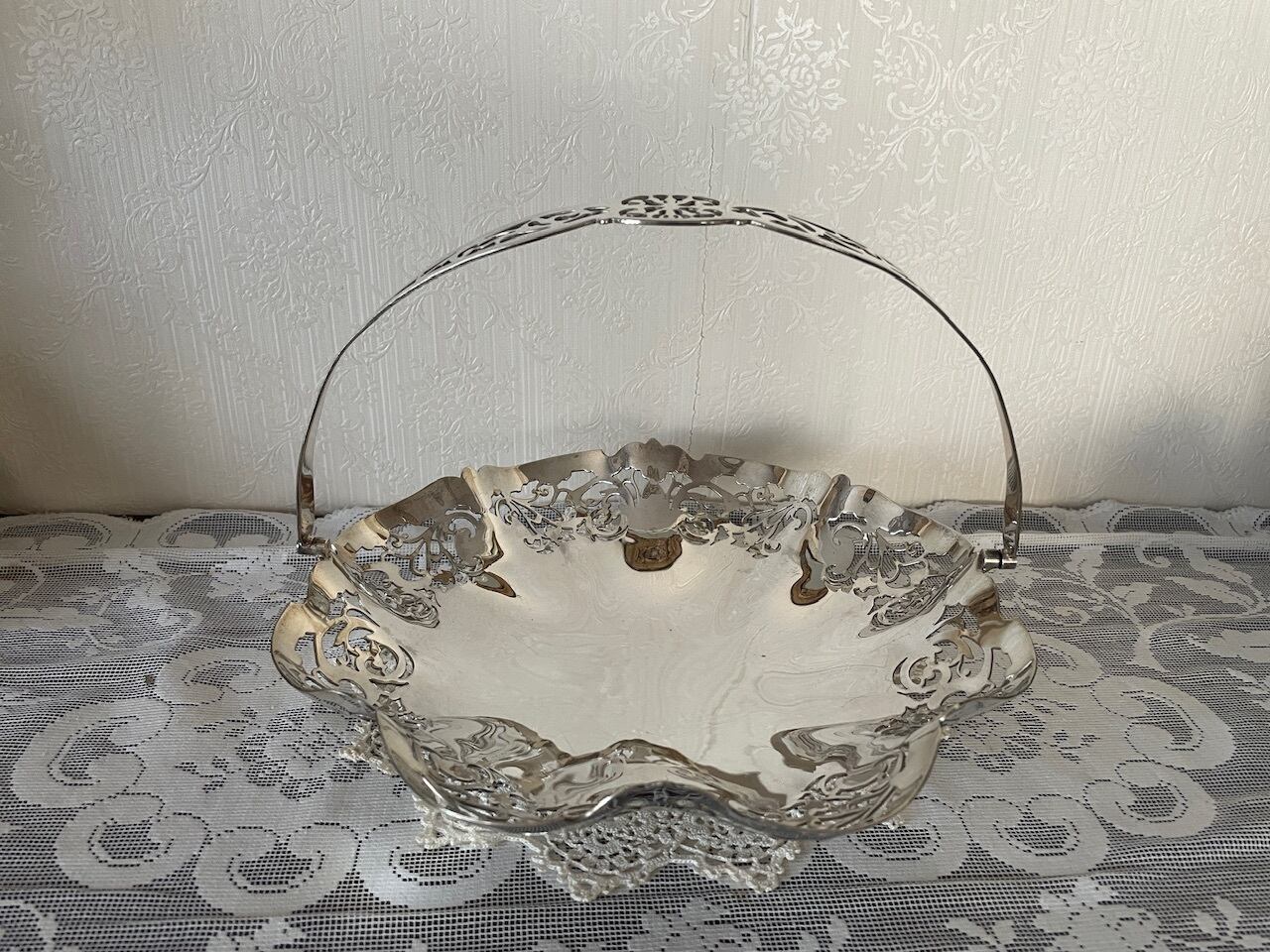 透かし模様が美しい円形のシルバープレートのバスケットです。