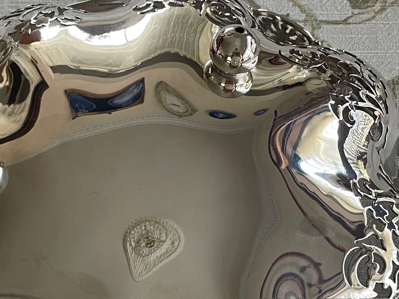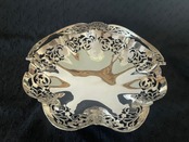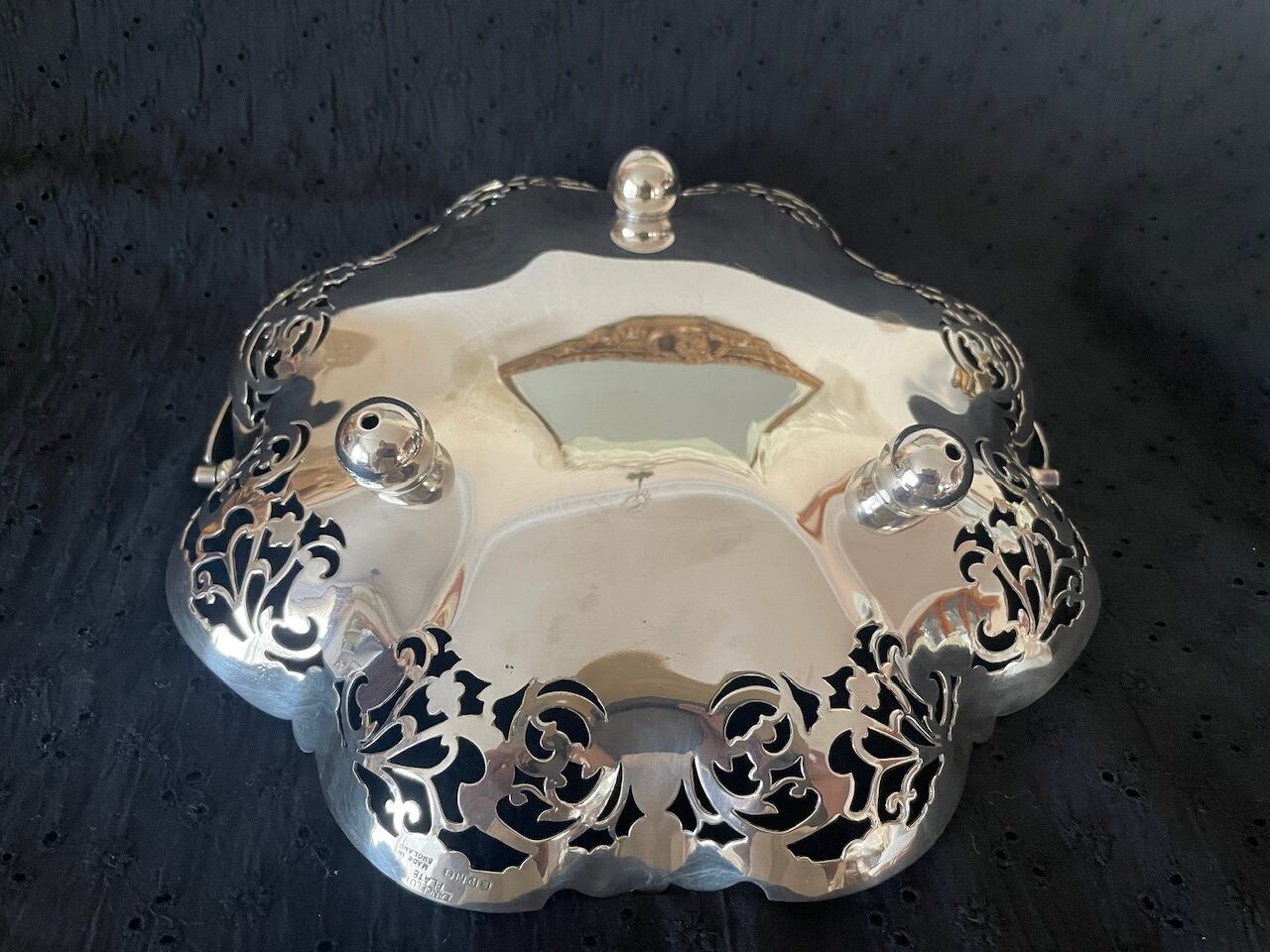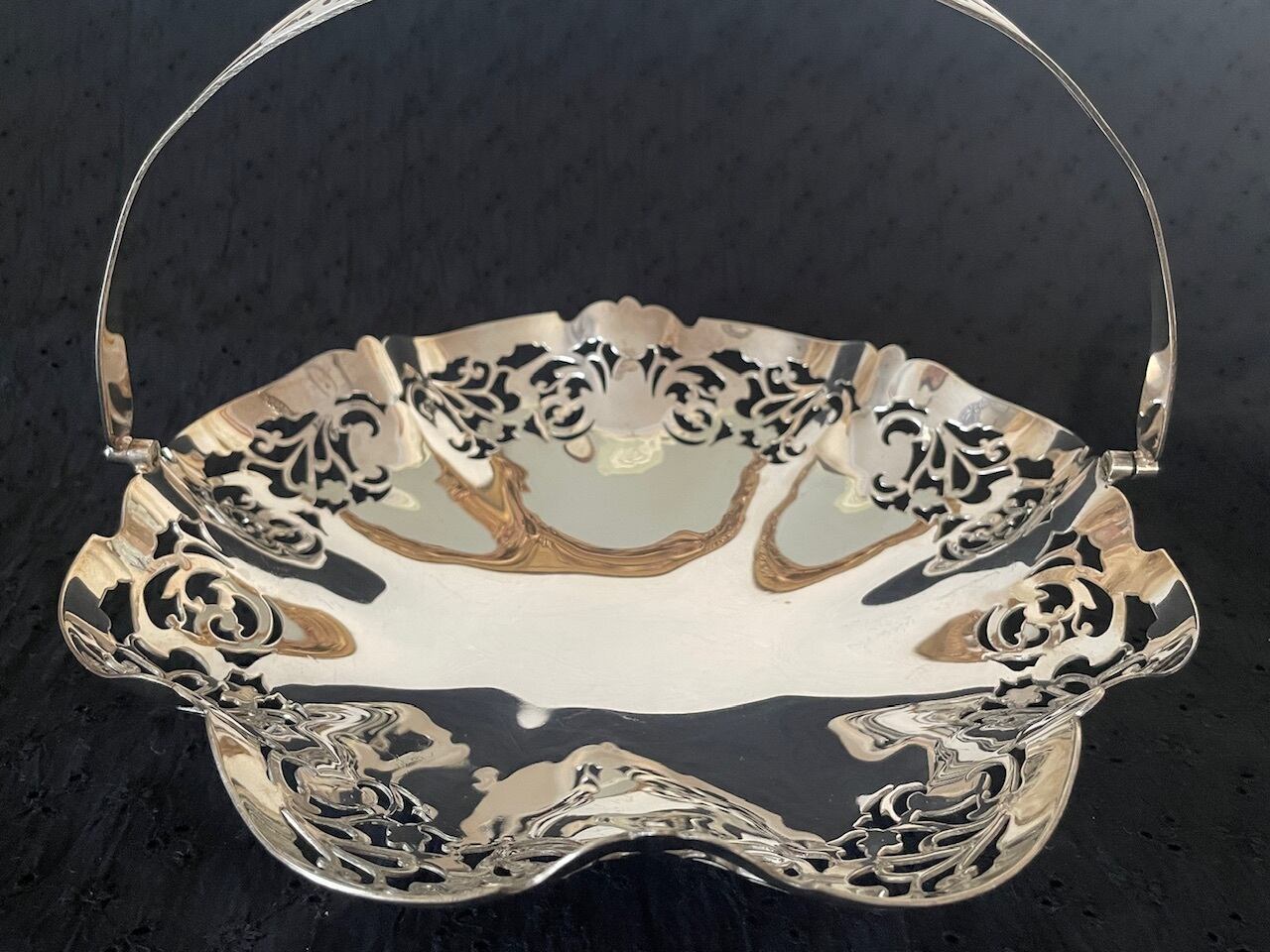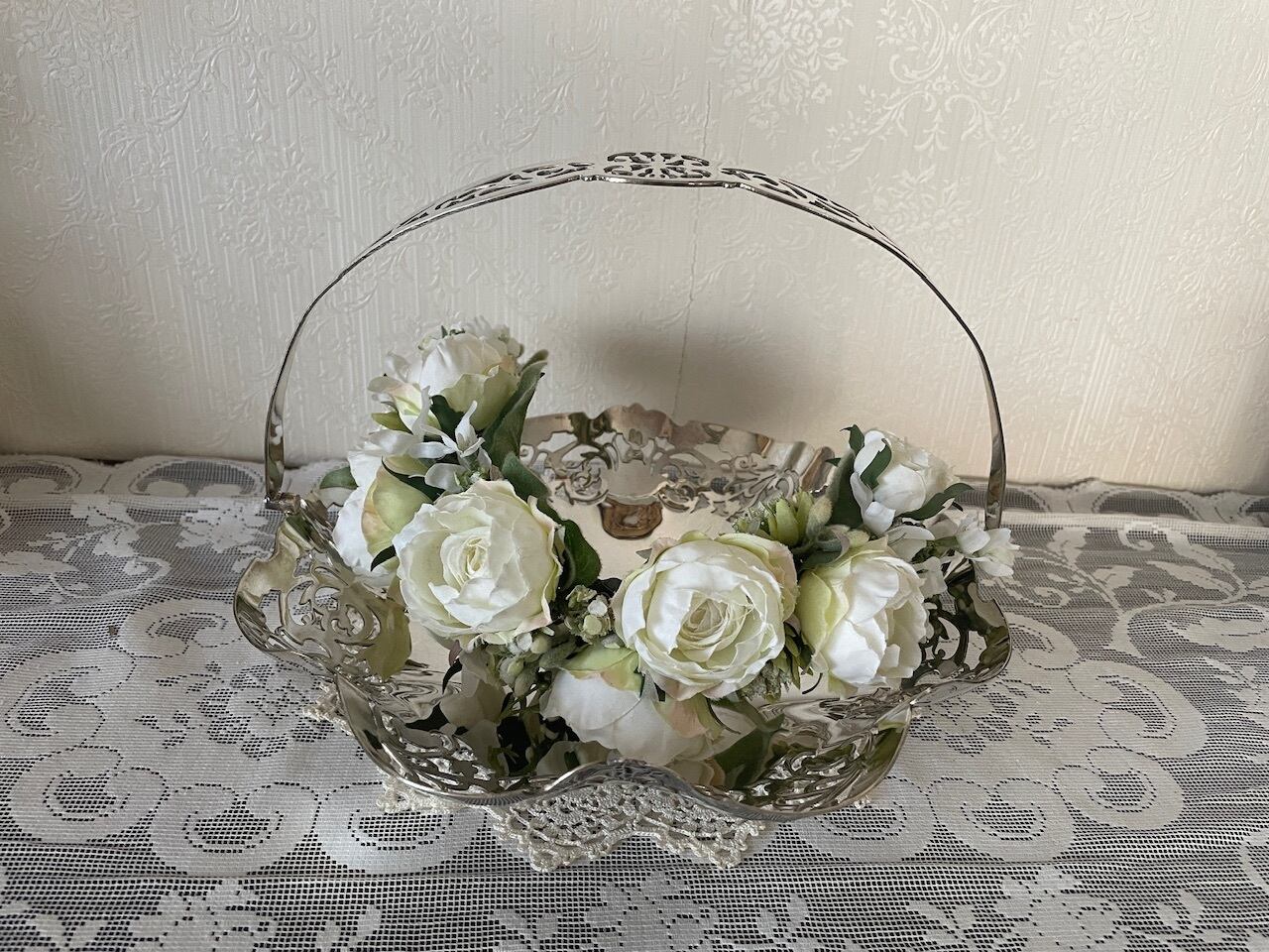 透かし模様が美しい円形のシルバープレートのバスケットです。