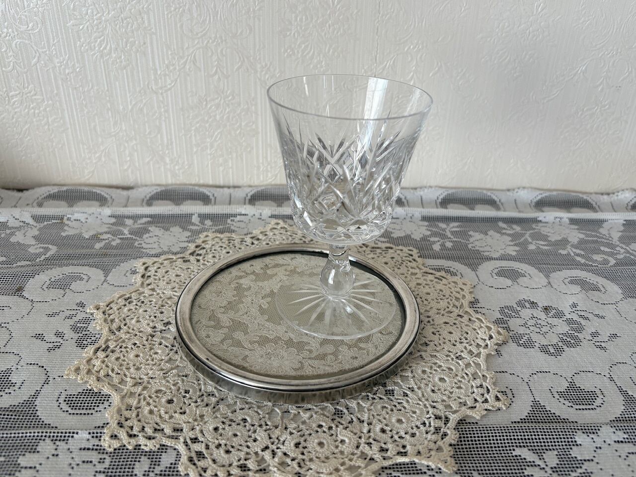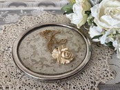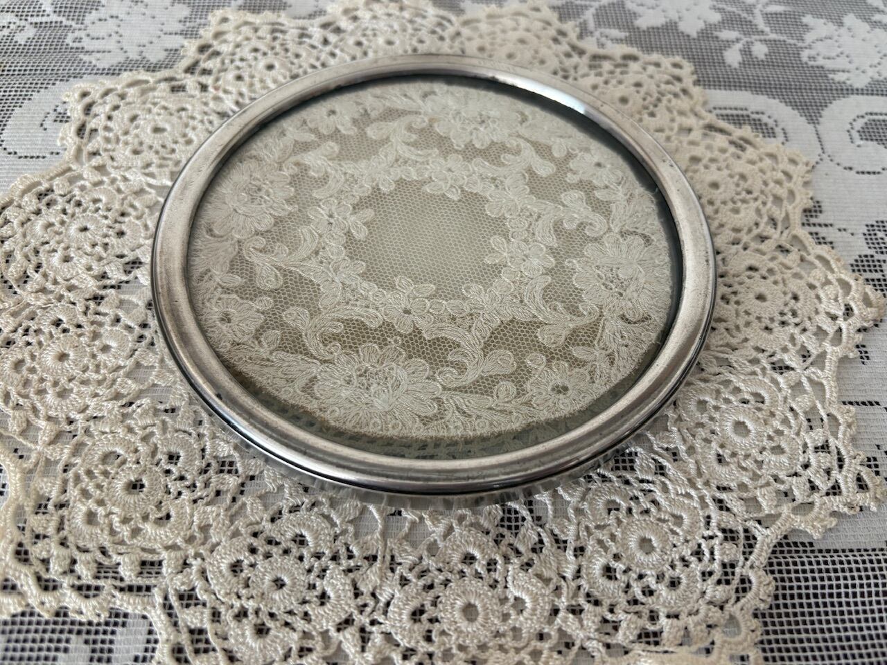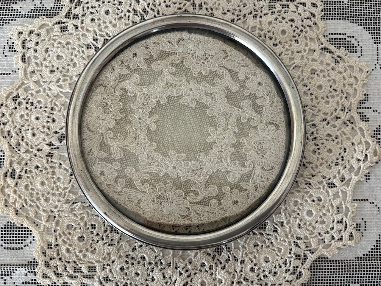 こちらのトレイは、金属の枠、そしてガラスの間にレースのドイリーを挟んでいます。