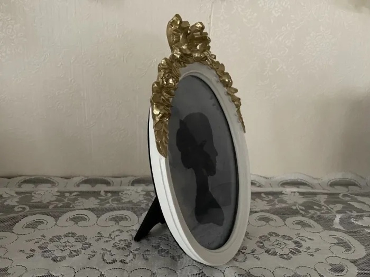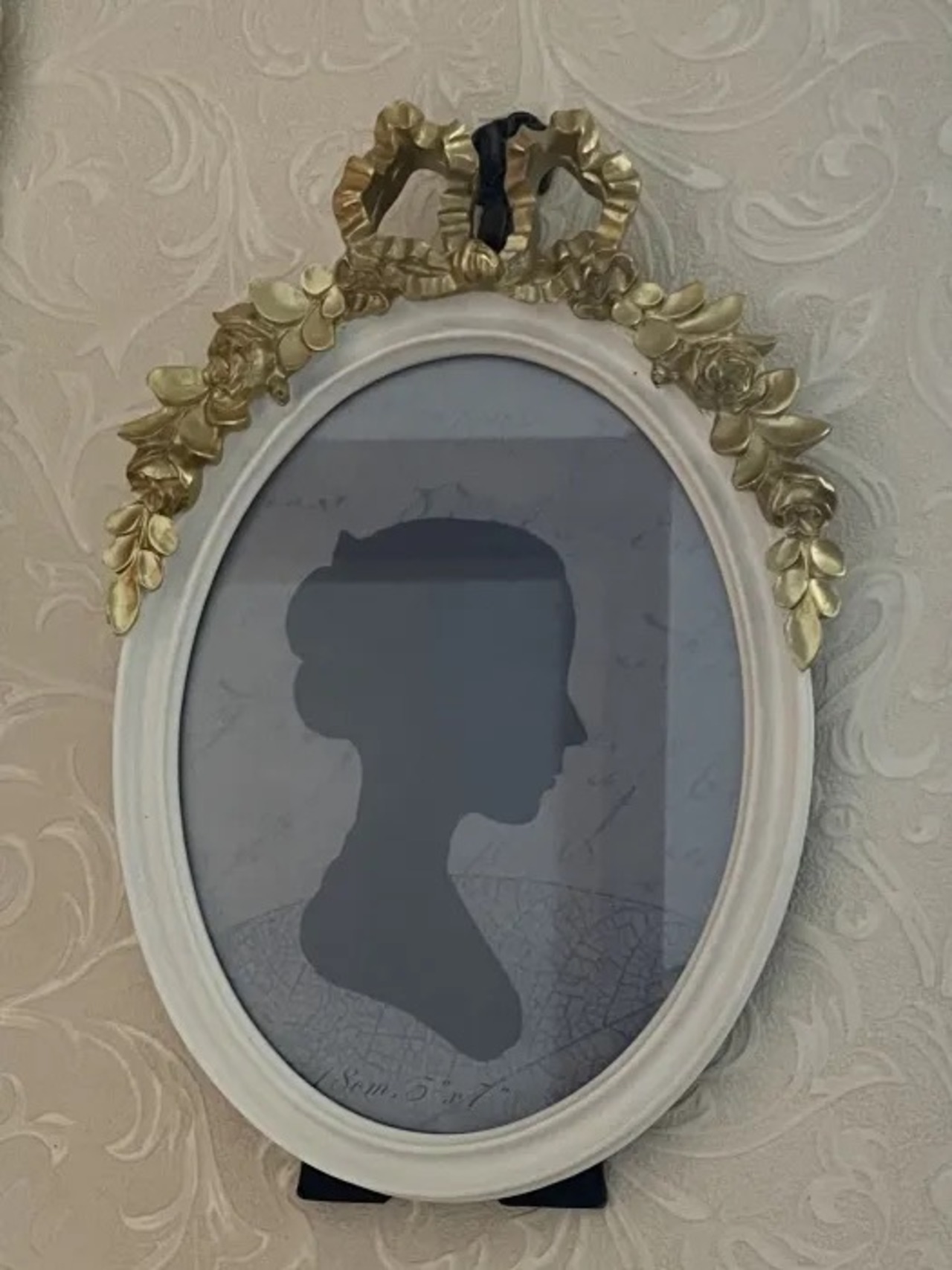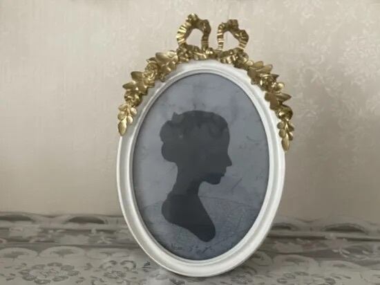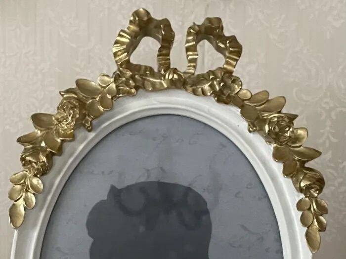 ホワイトのフレームにゴールドの大きなおリボンと薔薇が装飾されています。