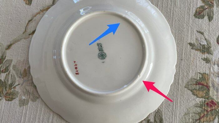 古い物でケーキプレートの裏側に製造時に出来るへこみがございます。