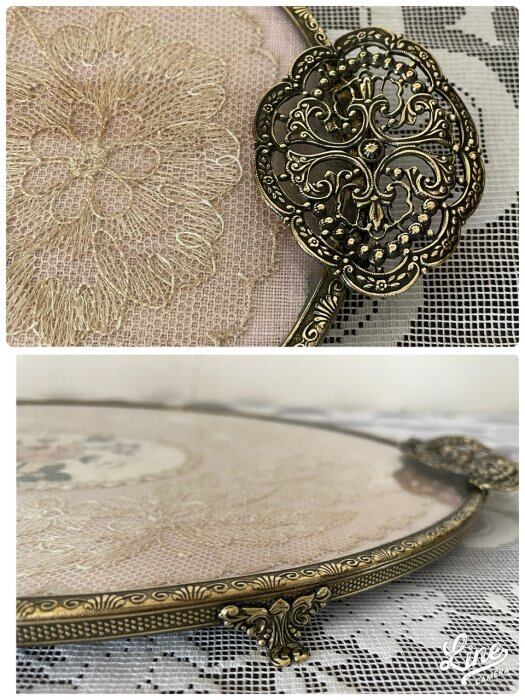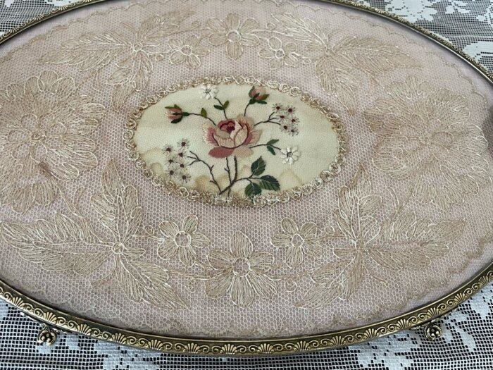 こちらのトレーは、金属の枠、そしてガラスの間にプチポワンの刺繍とレースを挟んでいます。