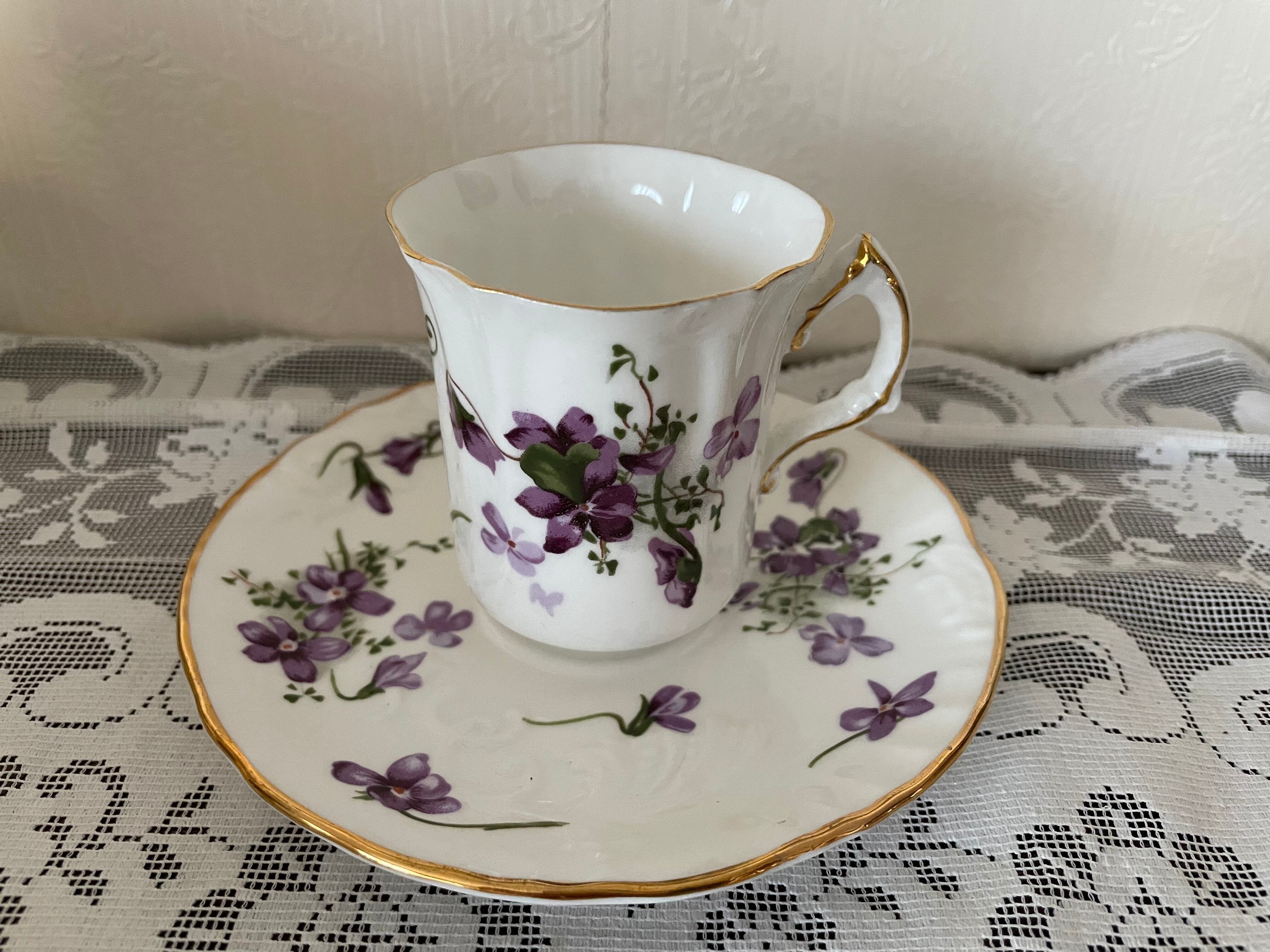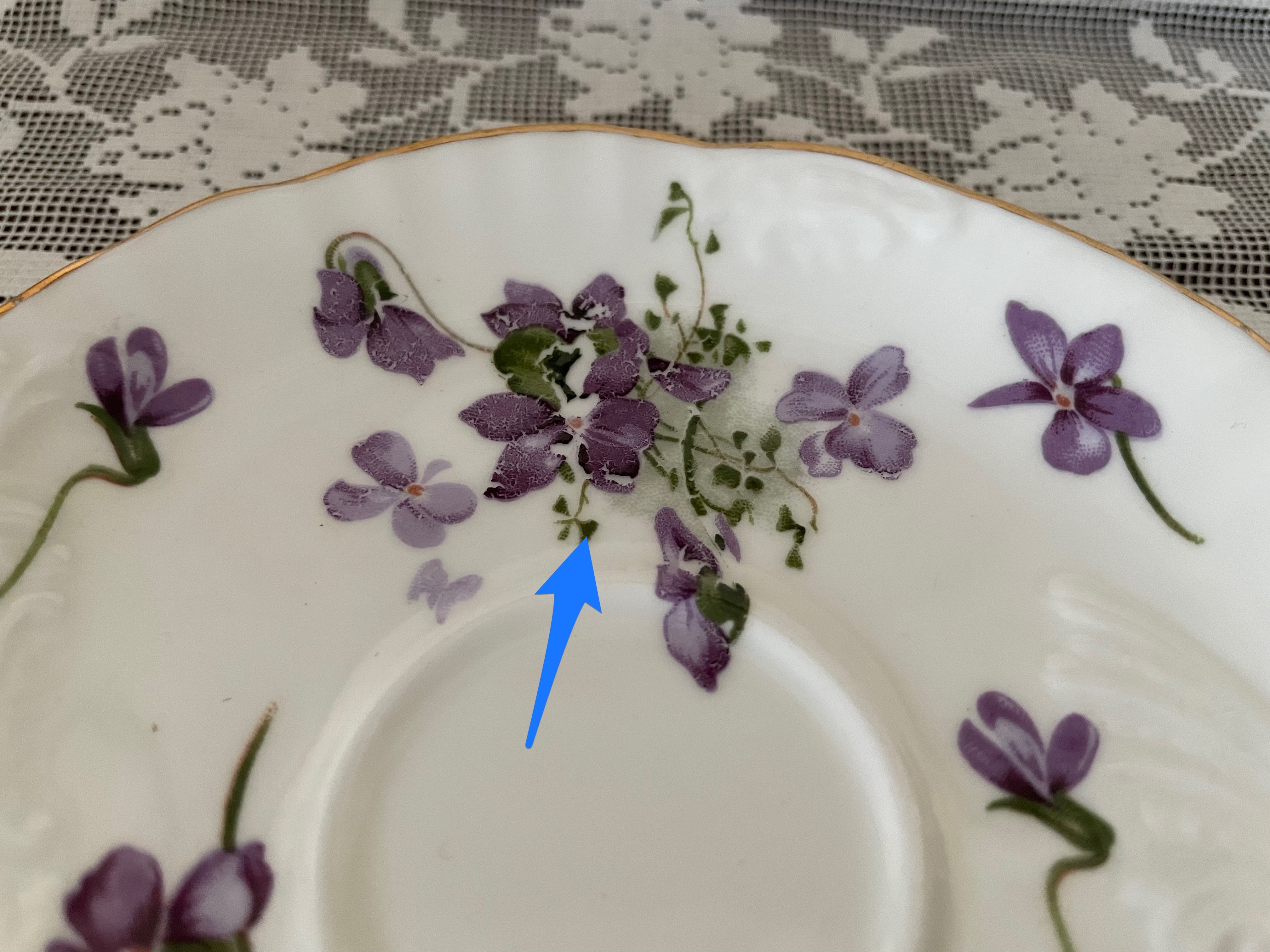 ボーンチャイナにパープル色のスミレがハンドペイントで描かれています。