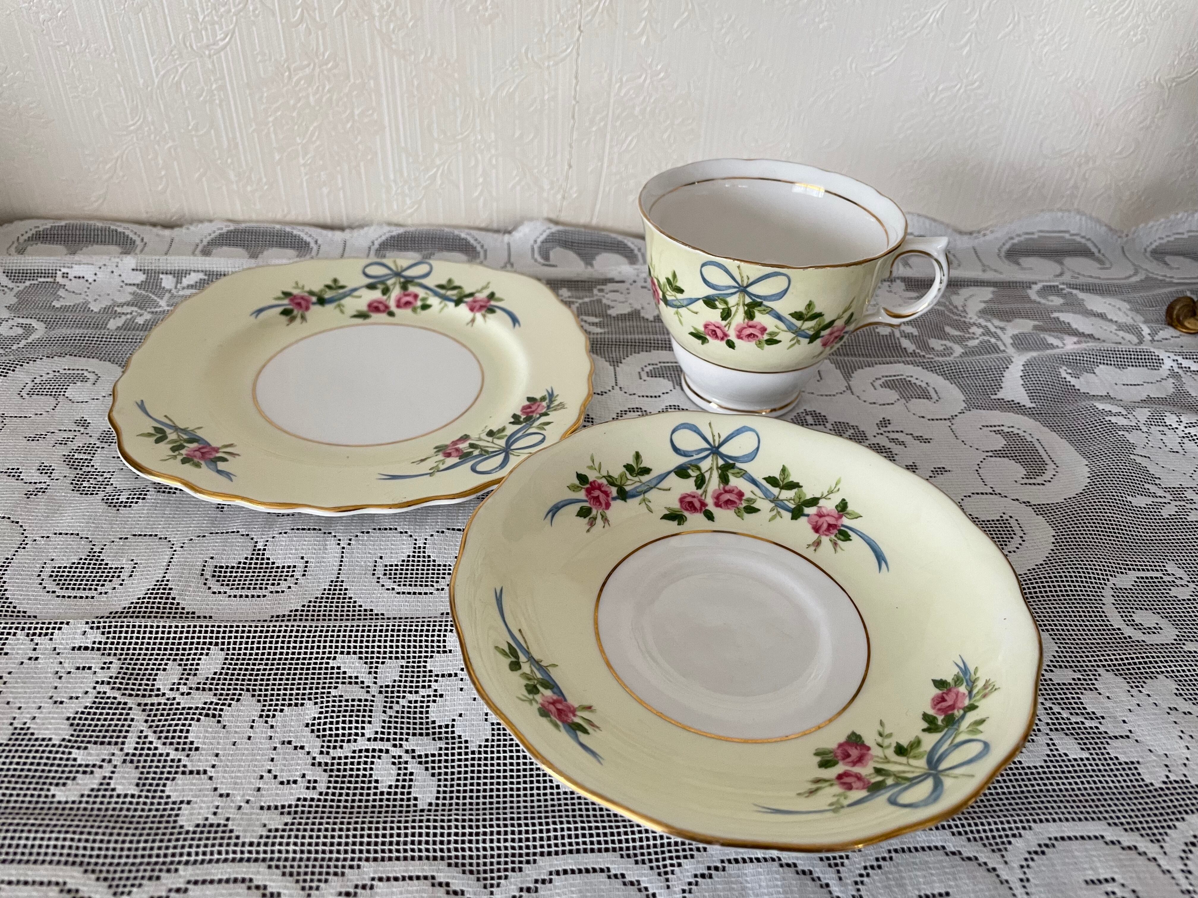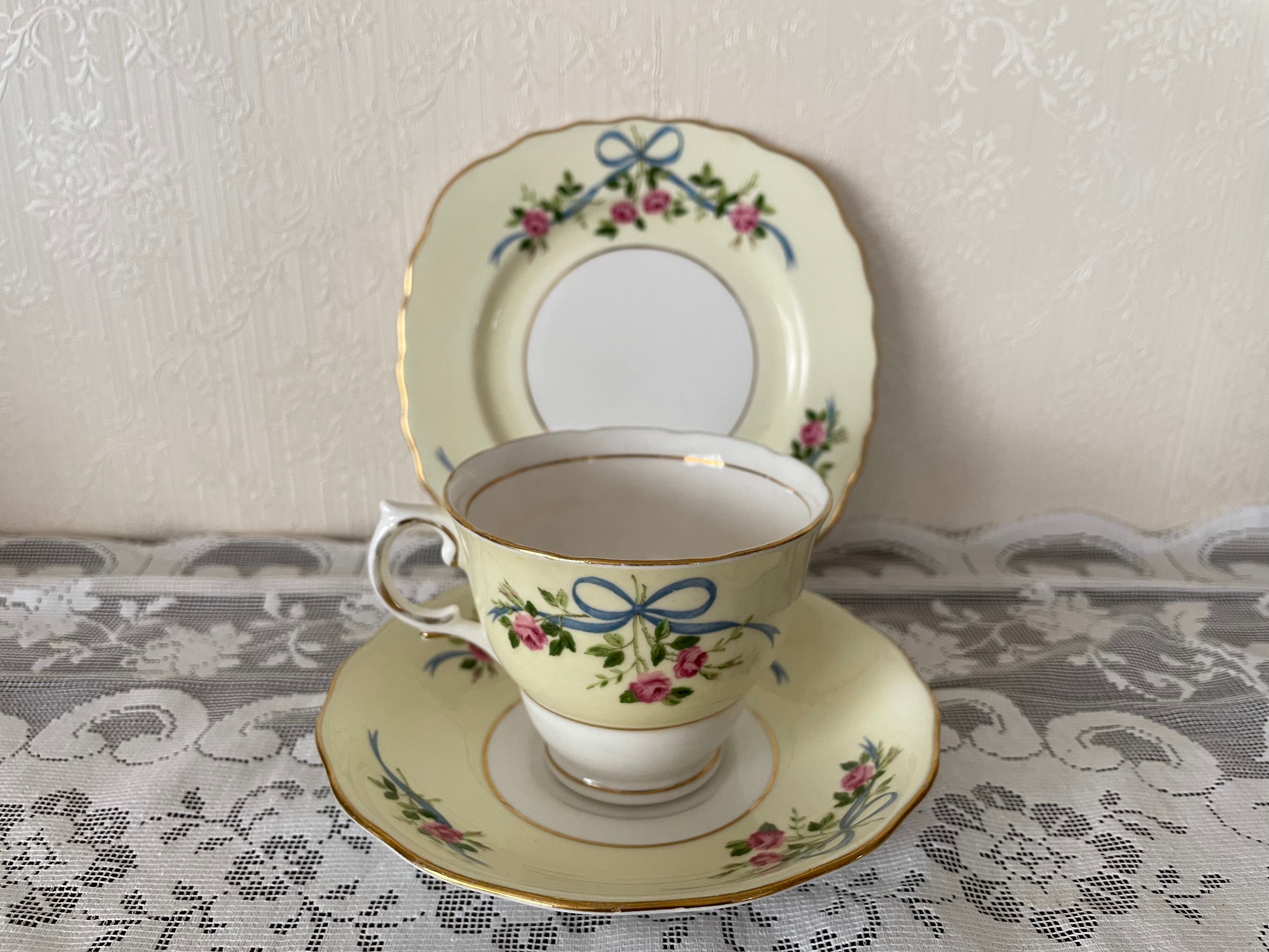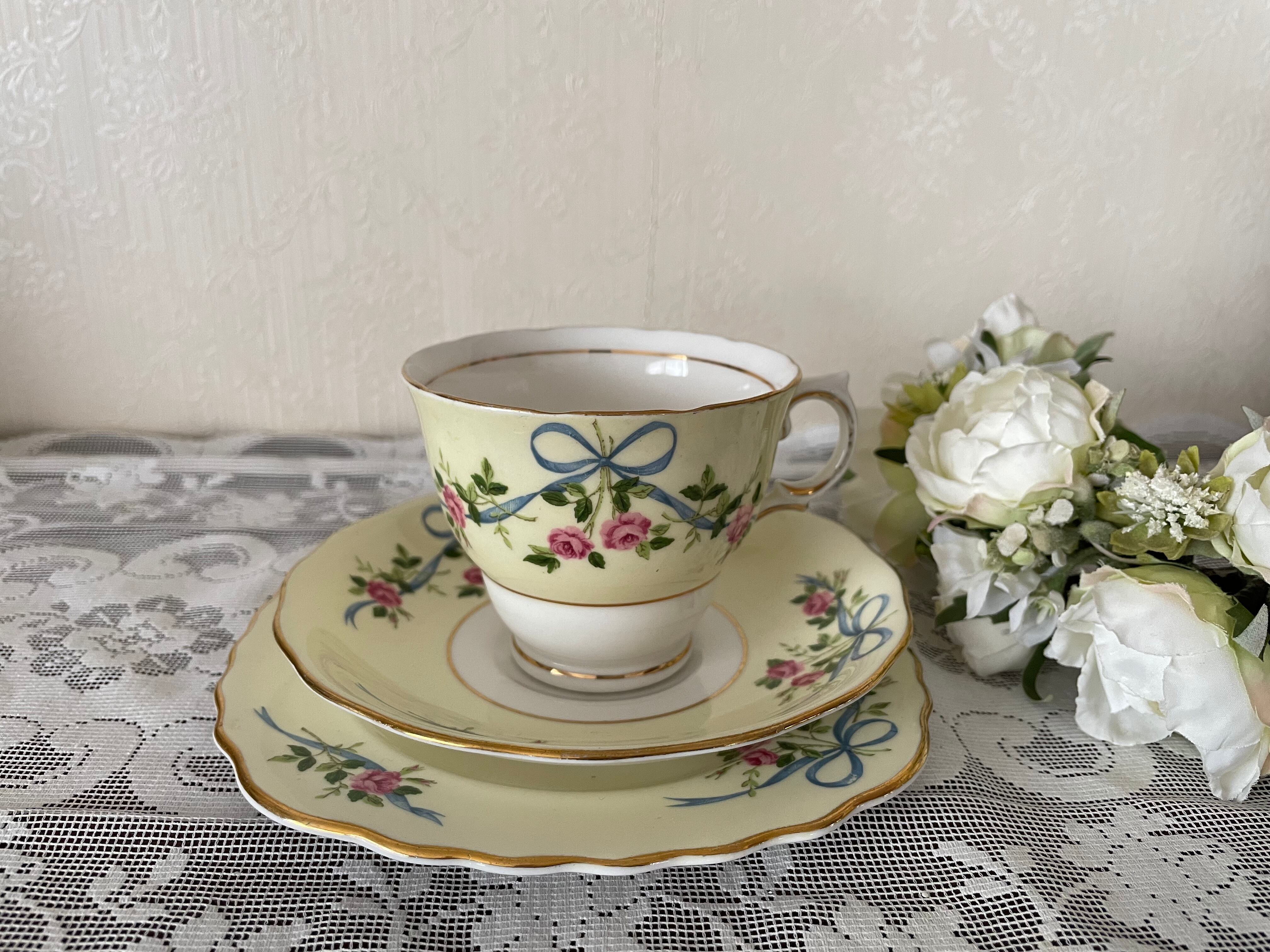 コルクラフのローズ&リボンのトリオ(カップ、ソーサー、ケーキプレート)