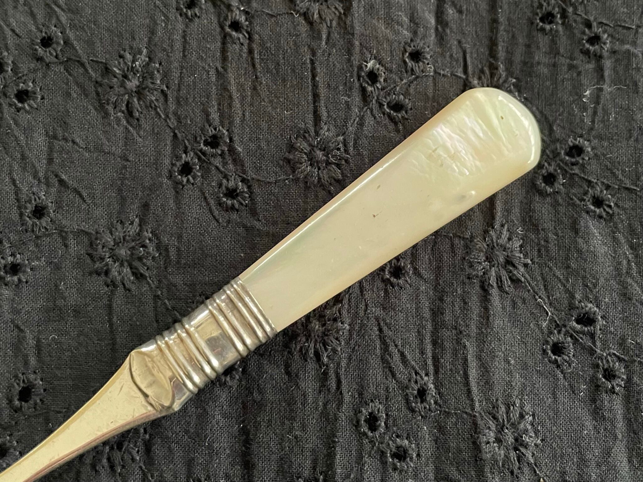 希少な白蝶貝を贅沢に使用したフォークはアンティークならではですね。