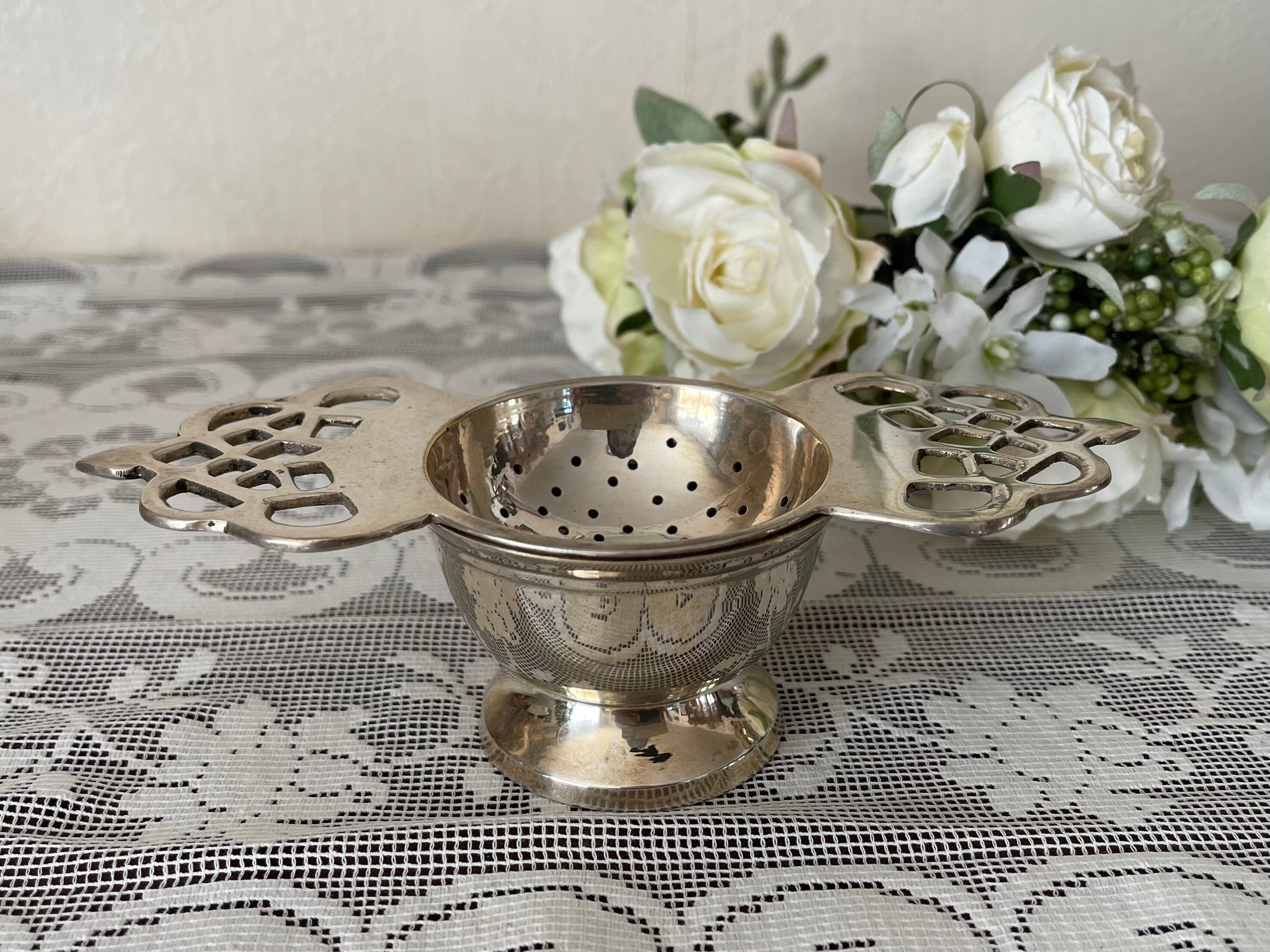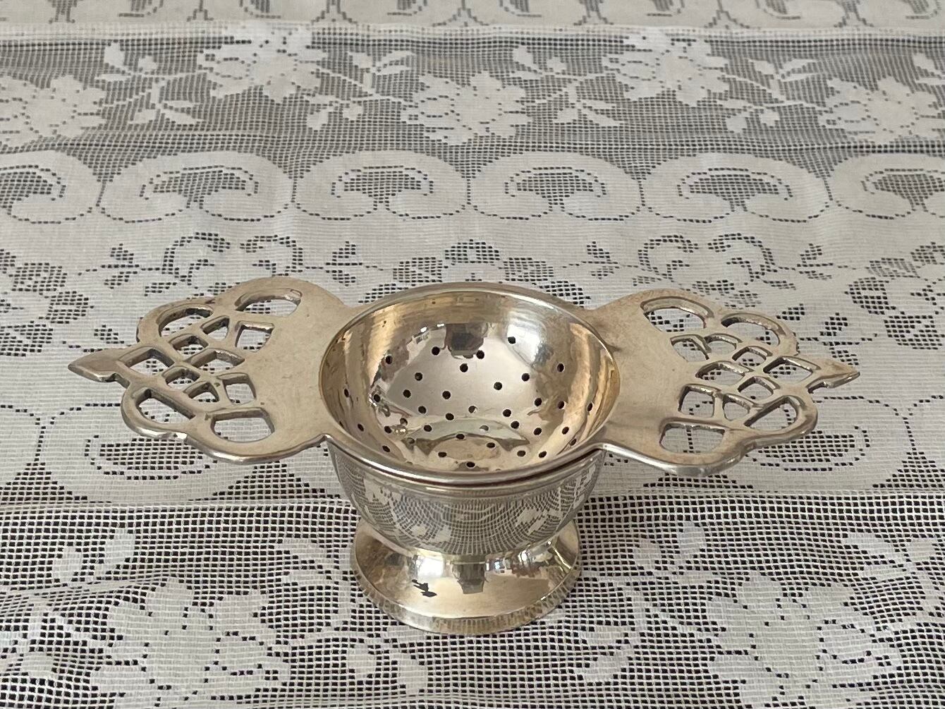 透かし細工がとても魅力的なシルバープレートのティーストレイナーです。