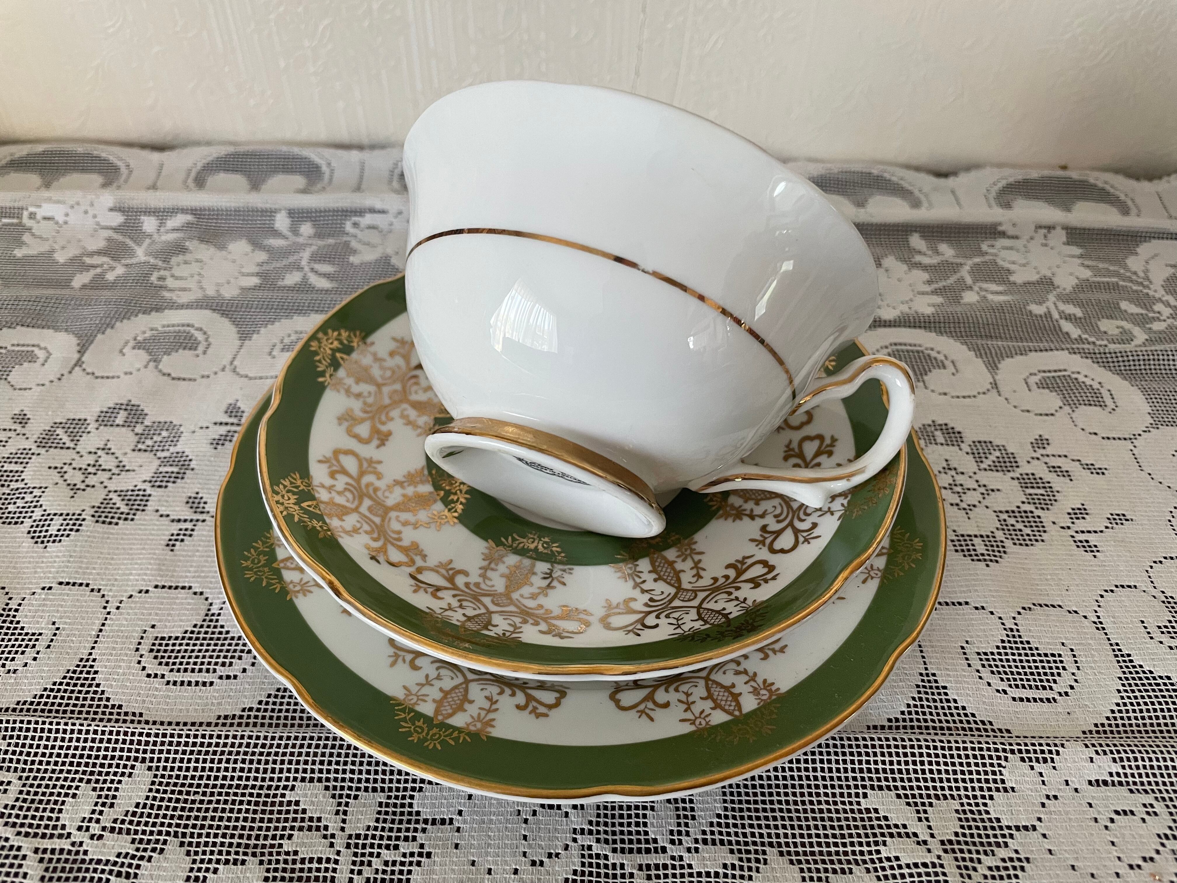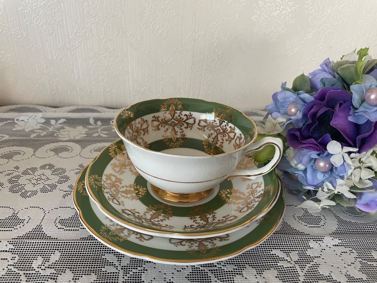 深みのあるグリーンのボーダーに豪華な金彩が載せられた華やかなお品です。