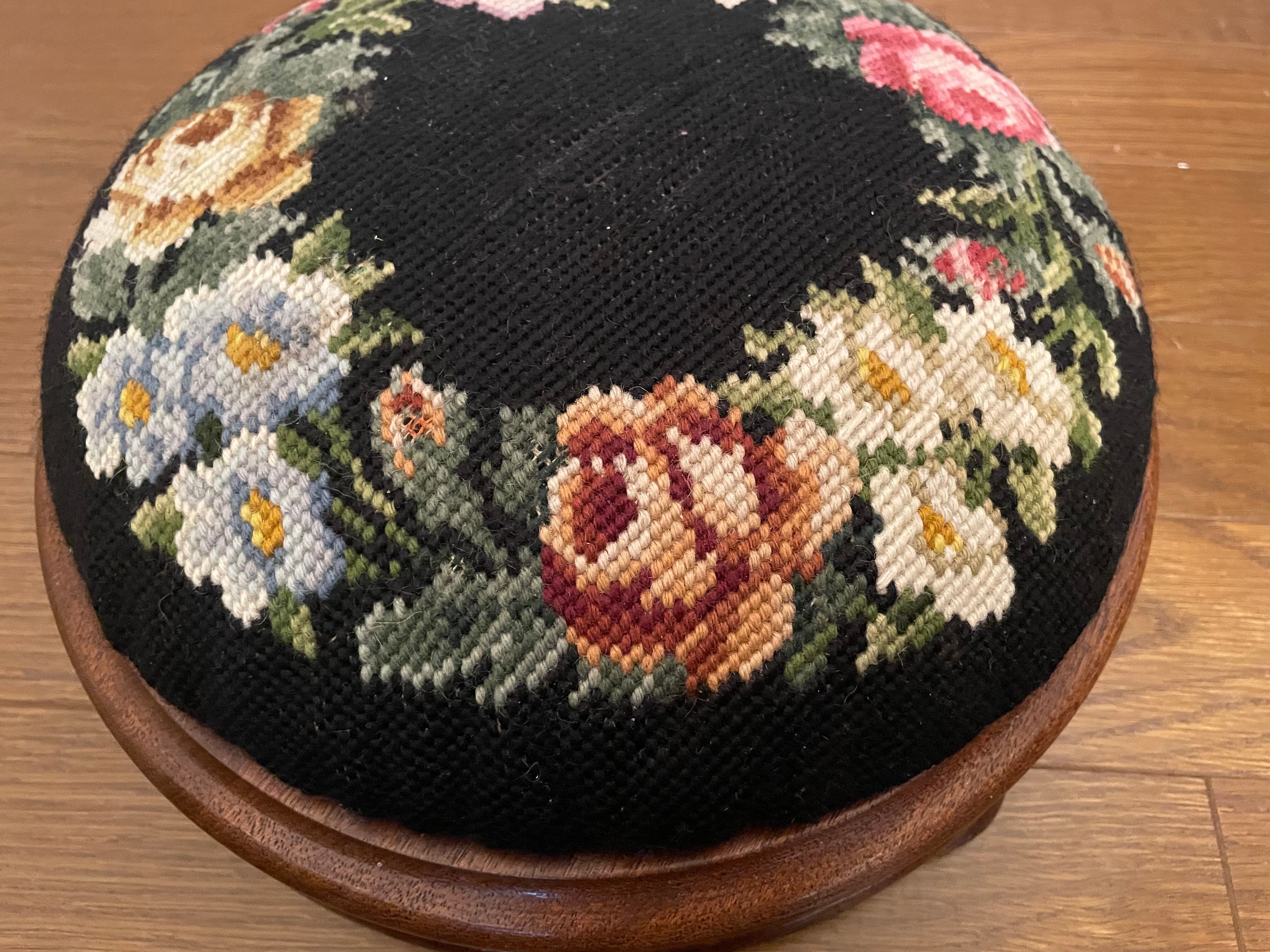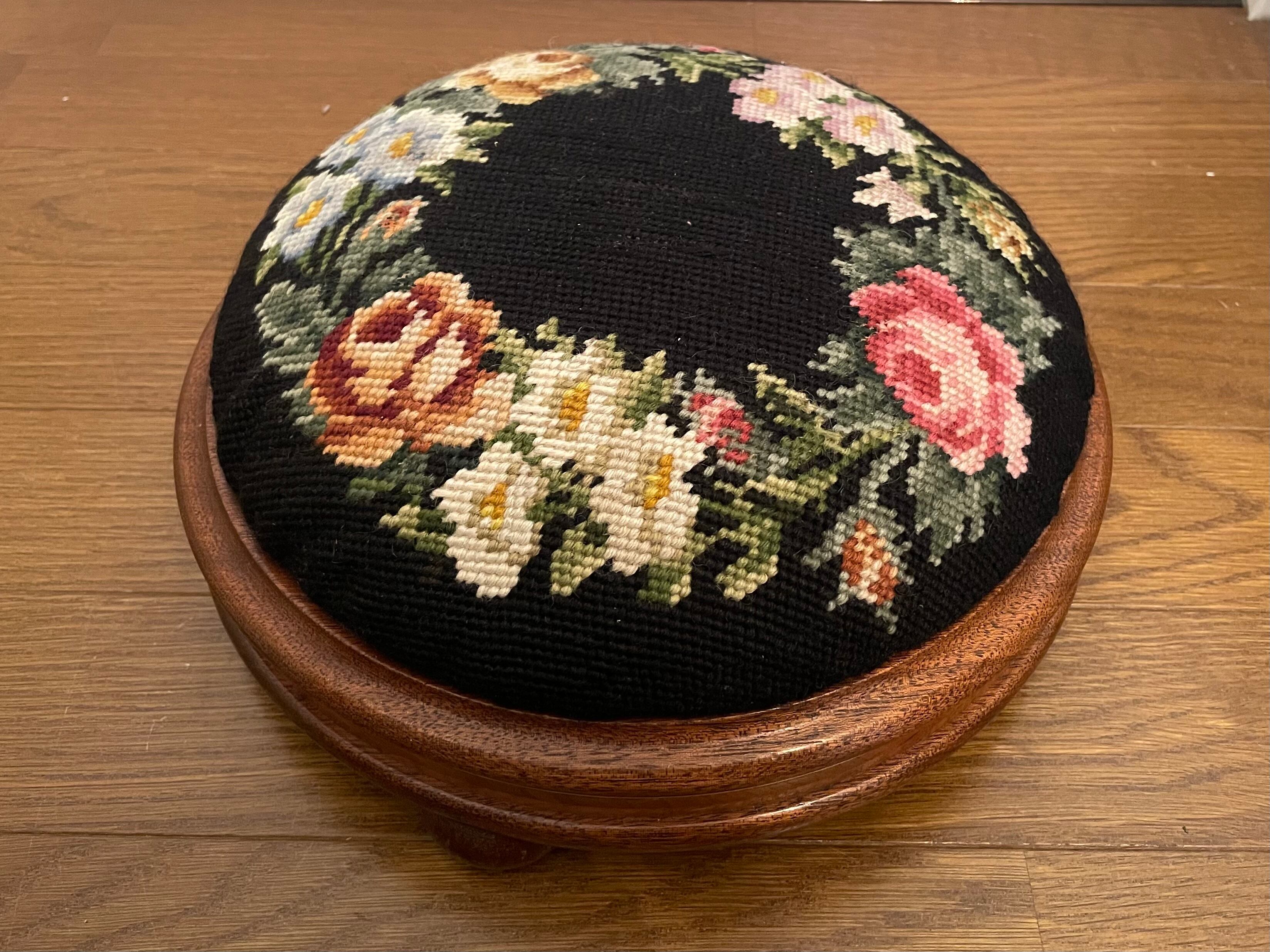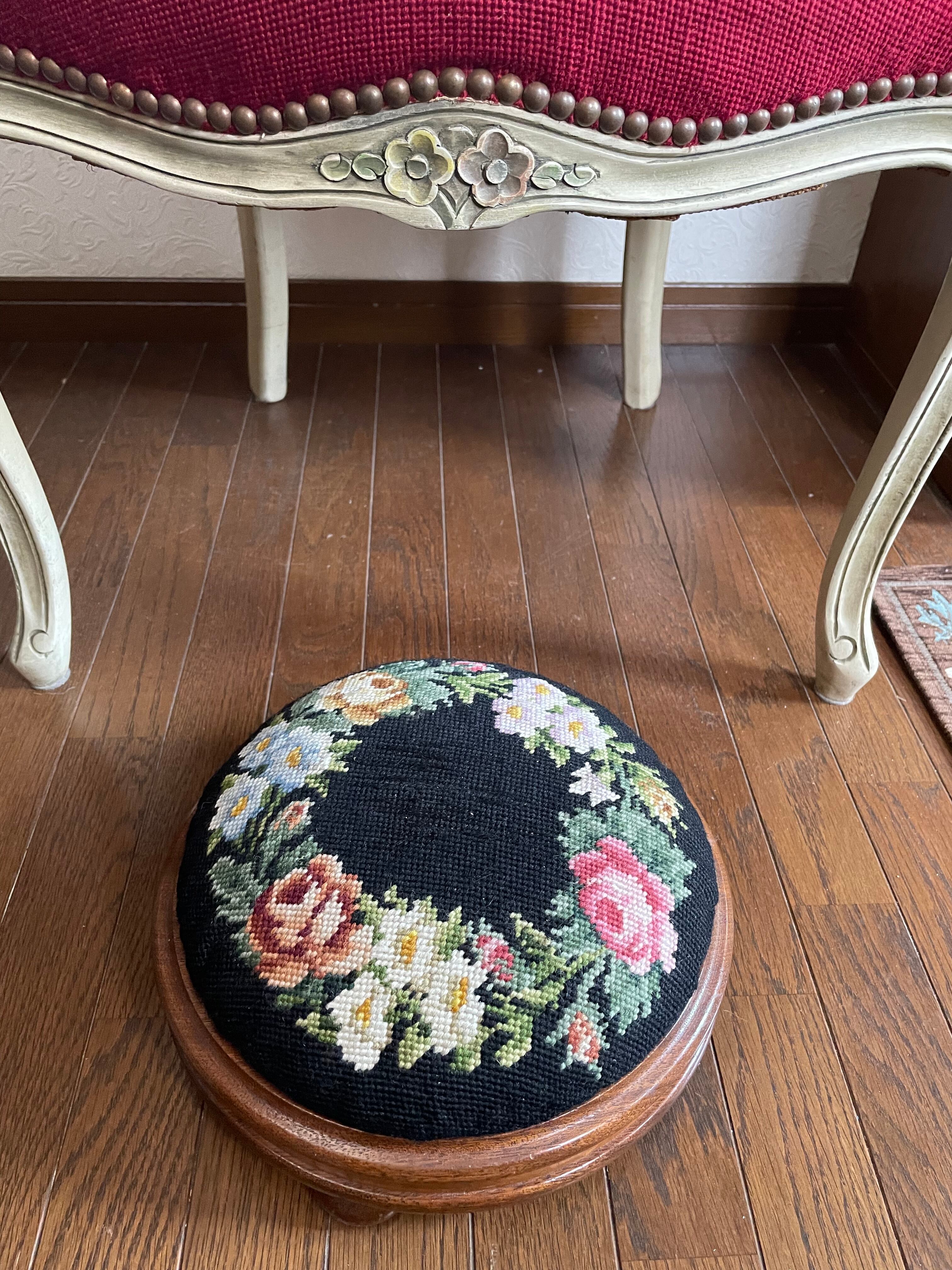 薔薇のブーケの美しいニードルポイントのフットスツールです。